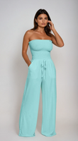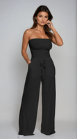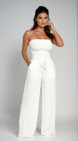 The Valentina Strapless Jumpsuit is your go-to piece for laid-back elegance. Crafted from soft, breathable fabric with a flattering shirred bodice and relaxed wide-leg silhouette, this jumpsuit moves with you—no matter where your day takes you. With its easy pull-on design and variety of stylish shades, it’s the ultimate blend of comfort, confidence, and cool.